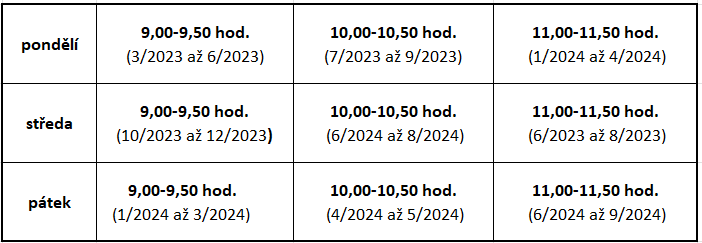 Děti jsou rozděleny do skupin podle věku – měsíc a rok narození jsou uvedeny v tabulce níže.